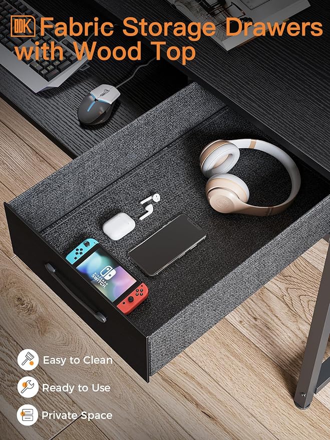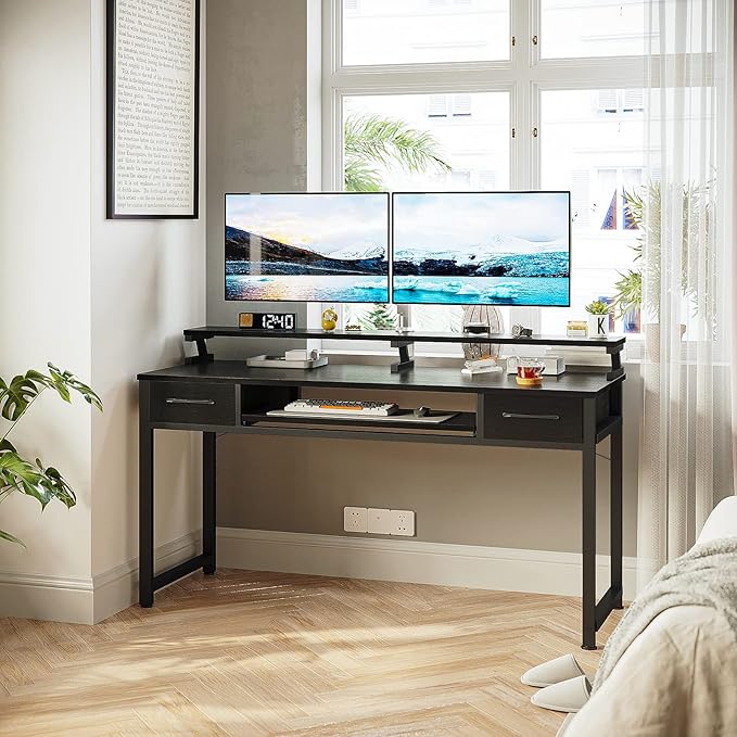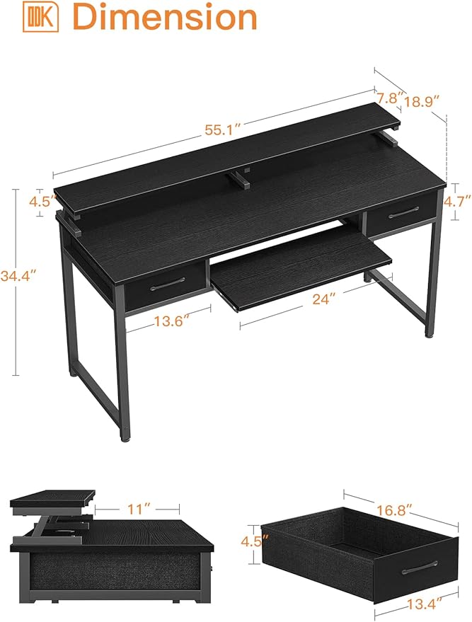 ODK Computer Desk Study Table, 55 Inch Office Desk with Drawers and Keyboard Tray, Study Desk Work Desk with Monitor Shelf, Writing Desk with Storage for Home Office, Black