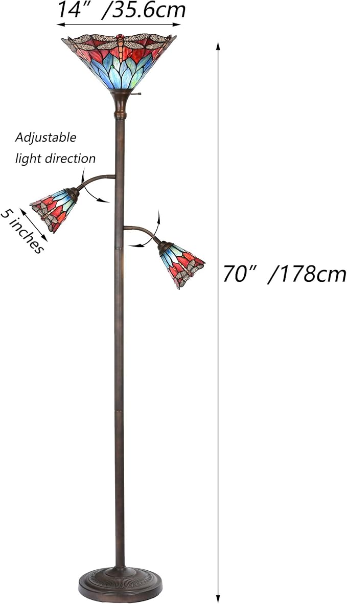 Bieye L10837 Dragonfly Tiffany Style Stained Glass Torchiere Floor Lamp with Sidelights for Reading, 70-inches Tall (Dragonfly, Red Blue)