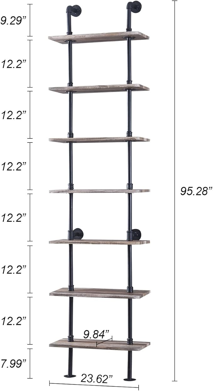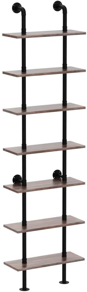 HOMBAZAAR Industrial Bookshelf, 7-Tier Industrial Pipe Bookshelf, Wall Mounted Ladder Shelves with Metal Frame for Home Office, Living Room, Oak Brown
