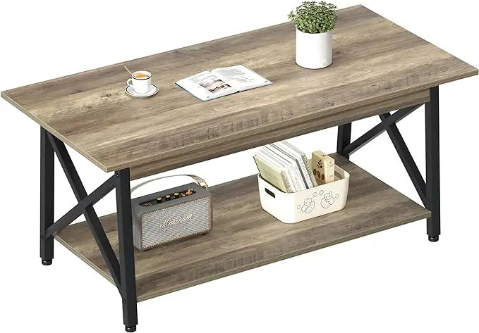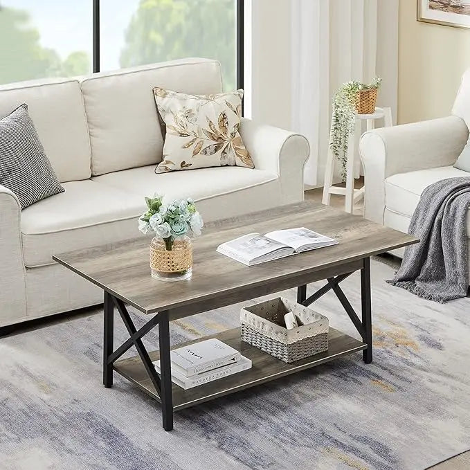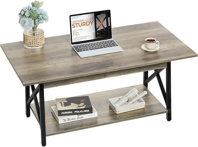 GreenForest Coffee Table Large 43.3 x 23.6 inch Rustic Farmhouse with Storage Shelf for Living Room, Easy Assembly, Grey WASH