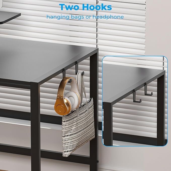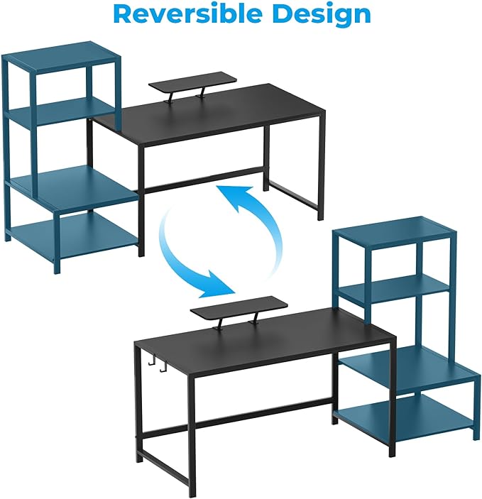 GreenForest Computer Desk 58 inch with Storage Printer Shelf Reversible Gaming Home Office Desk with Movable Monitor Stand and 2 Headphone Hooks for Study Writing PC Working, Black
