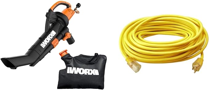 Worx 12 Amp TRIVAC 3-in-1 Electric Leaf Blower & Southwire 2588SW0002 Outdoor Cord-12/3 SJTW Heavy Duty 3 Prong Extension Cord-for Commercial Use (50', Yellow), 50 Feet
