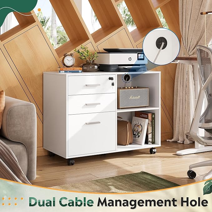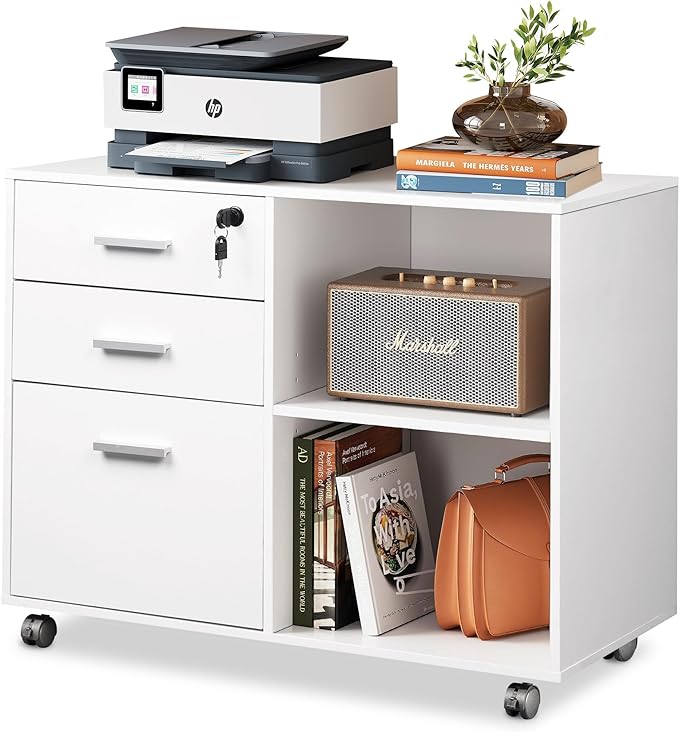 DEVAISE 3-Drawer Wood File Cabinet with Lock, Mobile Lateral Filing Cabinet, Printer Stand with Open Storage Shelves for Home Office, White