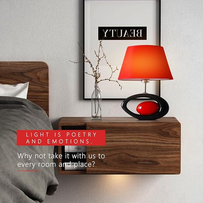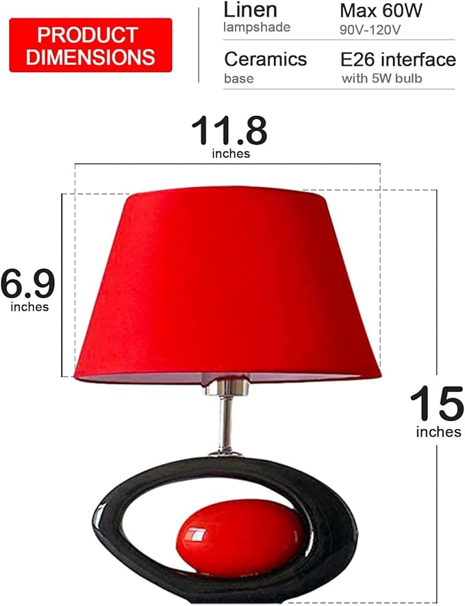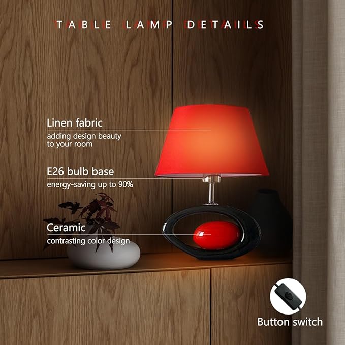 Red Modern Table Lamp, Ceramic Desk Lights with Linen Shade LED Bedroom Bedside Light Living Room Office Desk Night Lantern 14.8inch American Desktop Light for Home, E26 Base 60W 110V