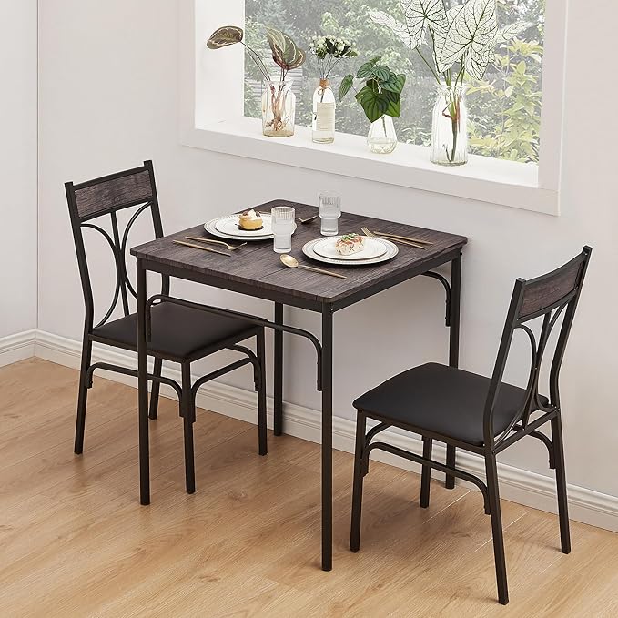VECELO Kitchen & Dinning Room 3 pieceTable Dinner Table Pu Cushion Chair Small Space,Modern Industrial Style, Dark Brown, Dining set for 2