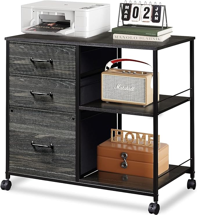 DEVAISE 3 Drawer Mobile File Cabinet, Rolling Printer Stand with Open Storage Shelf, Fabric Lateral Filing Cabinet fits A4 or Letter Size for Home Office, Charcoal Black Wood Grain Print