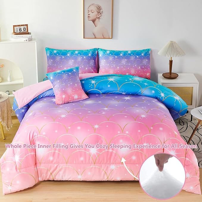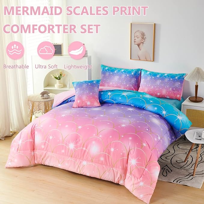 PERFEMET Mermaid Print Full Size Comforter Set for Girls, 6 Piece Colorful Tie Dye Teen Girl Bedding Set, Pink Purple Ombre Cute Bed in A Bag Comforter Set with Sheets