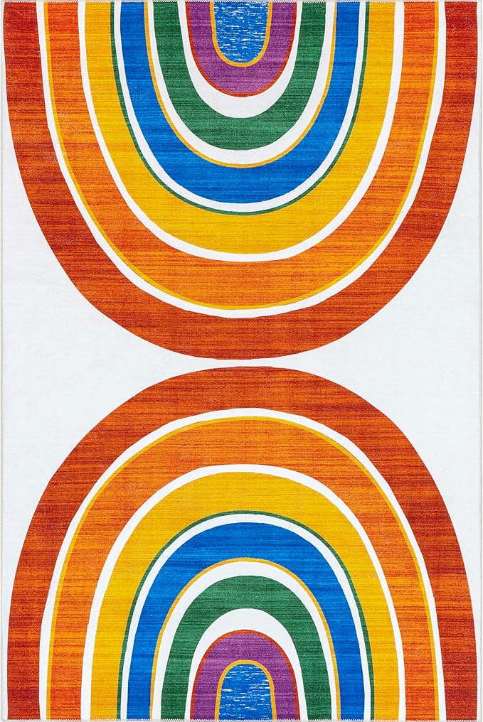 nuLOOM Classic Double Rainbow Machine Washable Kids Ultra Thin Area Rug, 3' x 5', White Multi