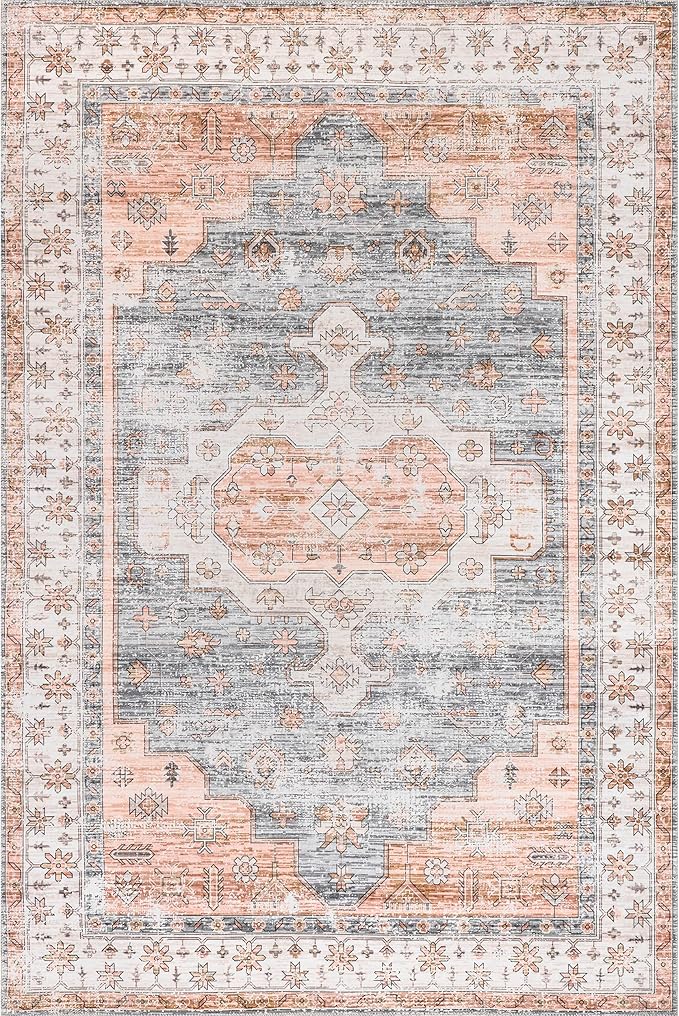 nuLOOM 8x10 Machine Washable Rain Haven Vintage Medallion Area Rug, Light Orange, Traditional Faded Design, Non-Slip Backing, Stain Resistant, For Bedroom, Dining Room, Living Room, Kitchen