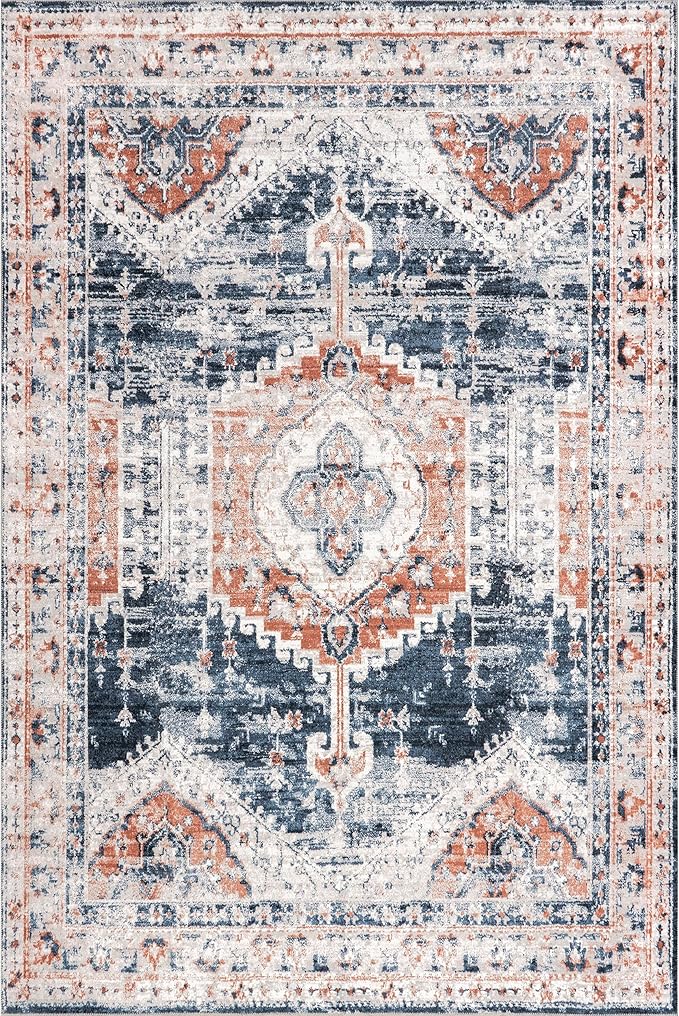nuLOOM Evette Traditional Medallion Machine Washable Ultra Thin Area Rug, 8' x 10', Navy