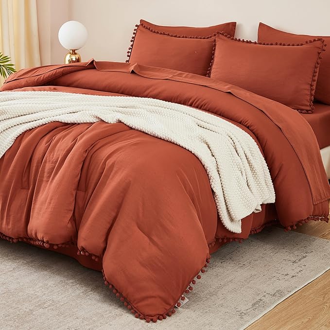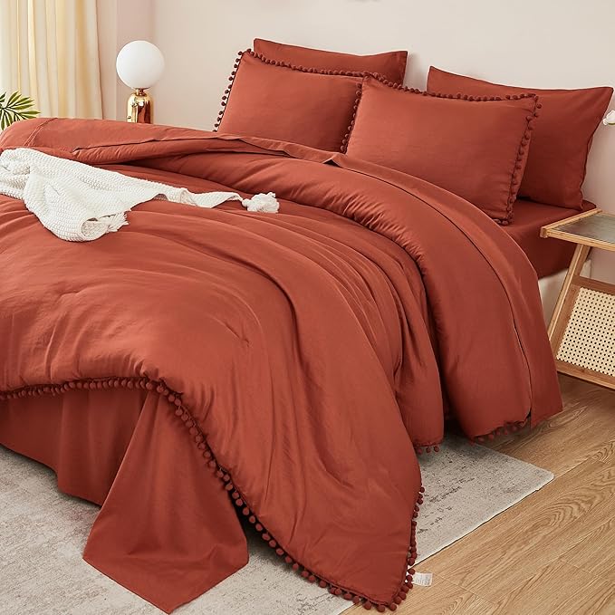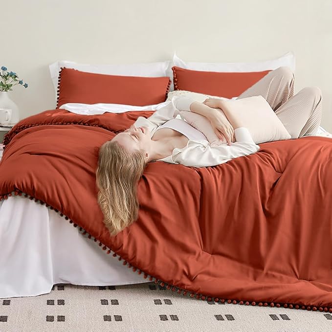 Litanika King Size Comforter Set Terracotta,3 Pieces Terracotta Boho Pom Pom Lightweight Bed Comforter, All Season Soft Solid Color Bedding Comforter Sets (1 Comforter 104x90 Inch, 2 Pillowcases)