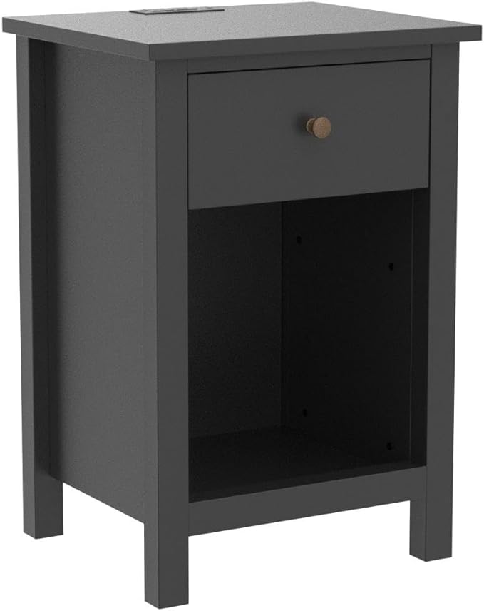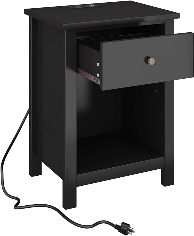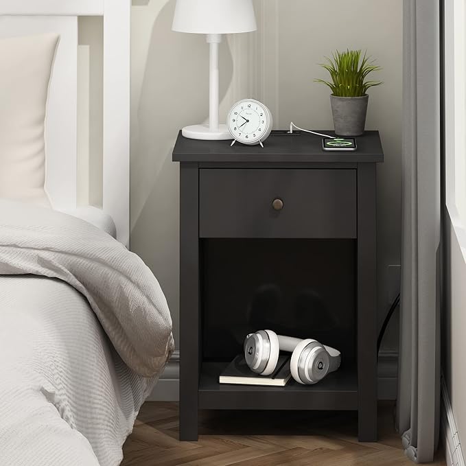 ChooChoo Nightstand with Charging Station, Wooden Top Bedside Table with Drawer and Storage Space for Bedroom, Black