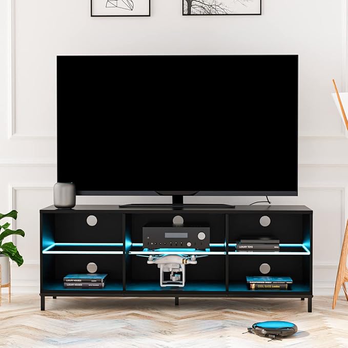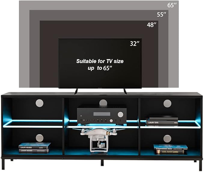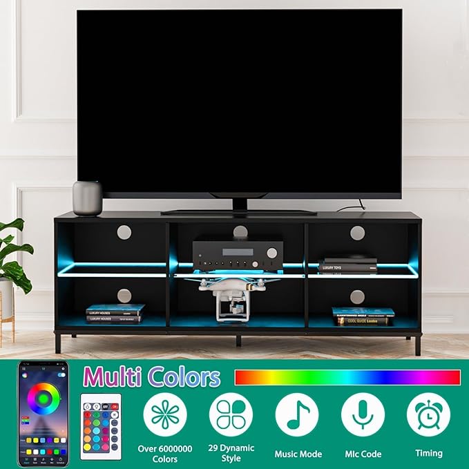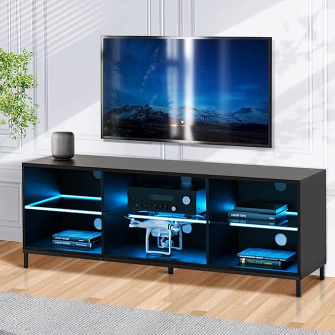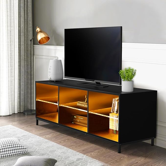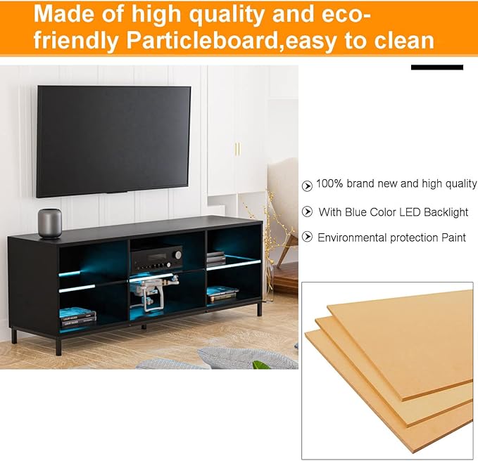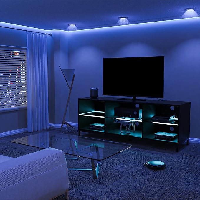 About This Particleboard + Glass TV STAND WITH LED LIGHTS: The black TV stand comes a radiant multi-color ambilight LED...