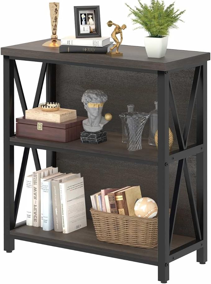 FATORRI Rustic Short 2 Shelf Bookshelf, Industrial Low Wood Bookcase, Farmhouse Small Book Case for Small Space (Walnut Brown)