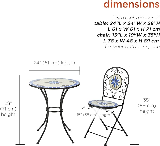 About This BISTRO SET: Elegant and chic bistro set, including one round table and 2 matching chairs PORTABLE: Ideal for...