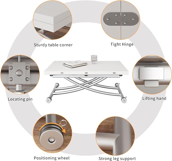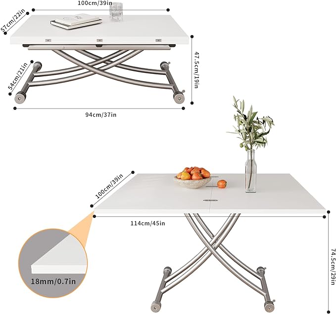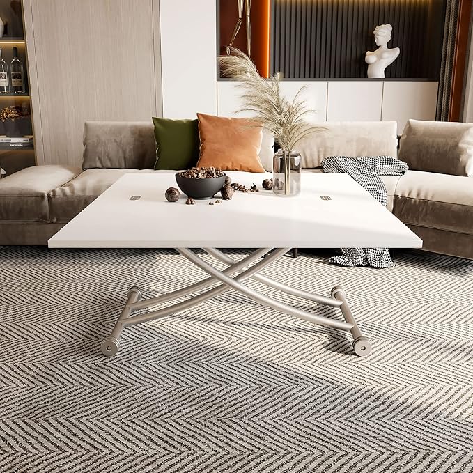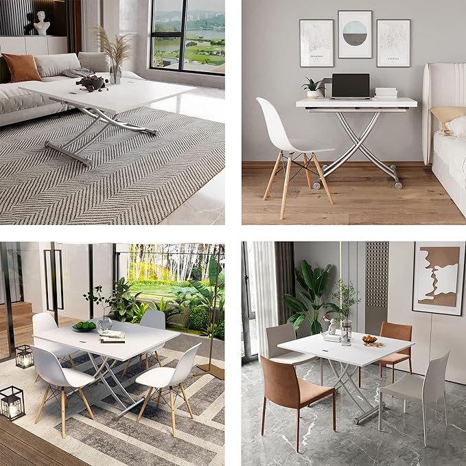 Height Adjustable Folding Dining Table Lift Top Coffee Table Converts to Dining Table with Sturdy Cross Metal Legs, Multi-Functional Space Saving Transform Table, White
