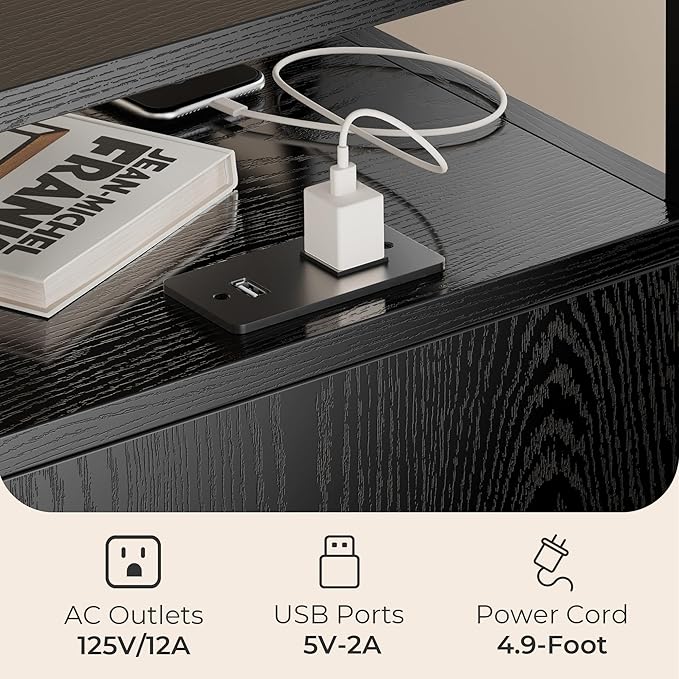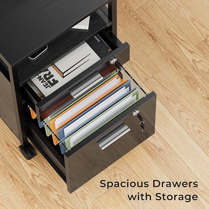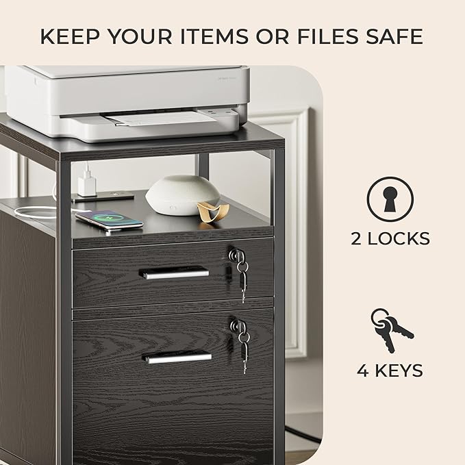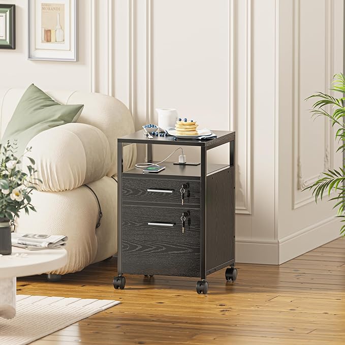 SUPERJARE File Cabinet with Lock & Charging Station, 2 Drawers Rolling Filing Cabinet, Office File Cabinet with Wheels & Open Shelf, for Home Office, A4/Letter Size Files Under Desk - Black
