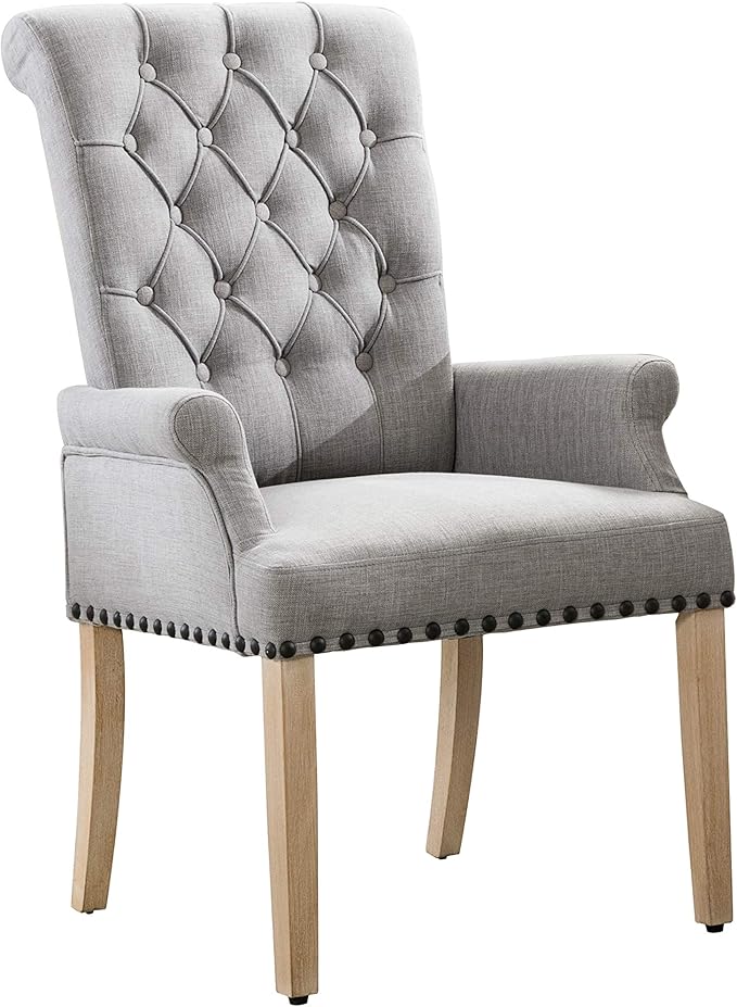 Dining Room Chairs with Arms,Tufted Upholstered High Back Nailed Trim with Untique Oak Wood Legs for Kitchen Restaurant Room Bedroom,Smoke Grey