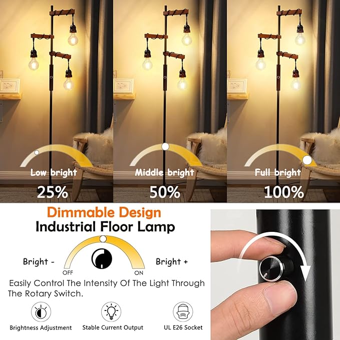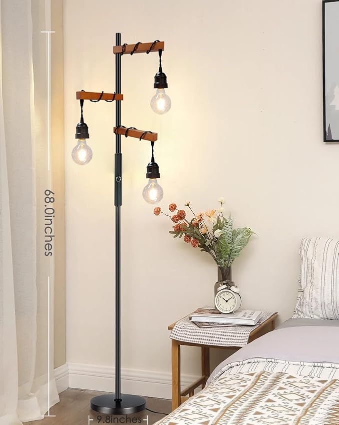 Dimmable Industrial Floor Lamp,Modern Farmhouse Tree Standing Lamp,68 Inch 3-Light Wood Tall Vintage Pole Lamps for Living Room Bedroom Office Rustic Home Decor