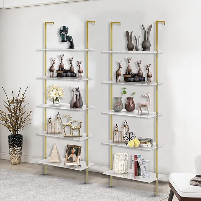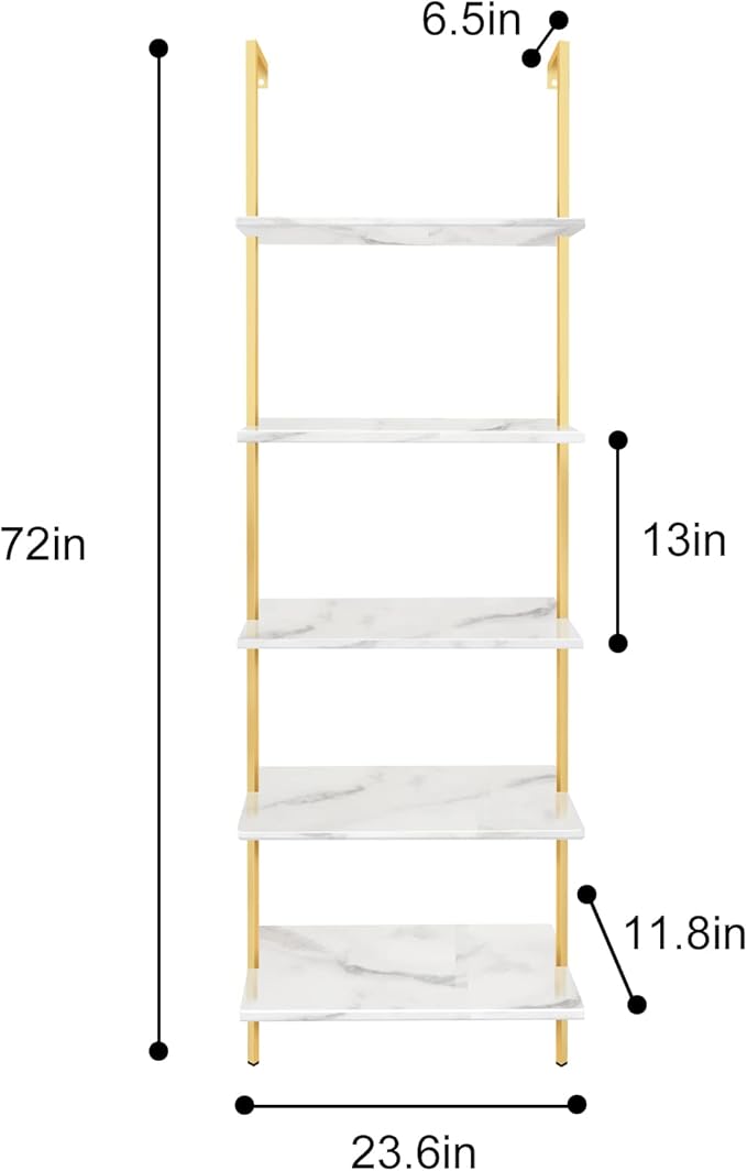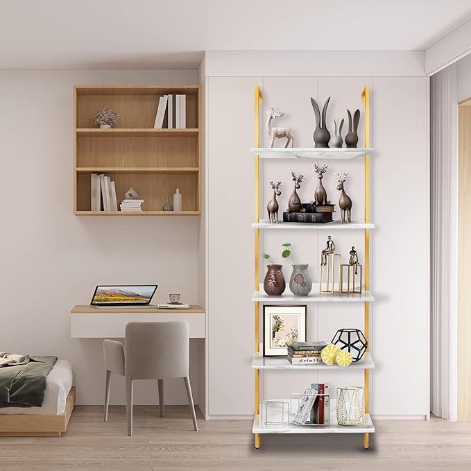 aboxoo Ladder Shelf White Marble Bookshelf 5-Tier Wall-Mounted Wood Rack Industrial Modern Plant Flower Stand Utility Organizer Open Bookcase Metal Frame Furniture Office Kitchen Bedroom