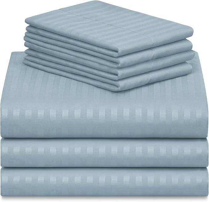 LuxClub 7 PC Split King Size Sheet Set Bed Sheets, Breathable Luxury Bed Sheets, Deep Pockets 18" Wrinkle Free Cooling Bed Sheets Machine Washable Hotel Bedding (Split King, Striped Light Blue)