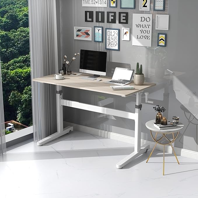 Manual Standing Desk Adjustable Height- Crank Mobile Standing Desk 55 x 24 Inches Sit Stand Desk Frame & Top, Stand Up Desk on Wheels, Computer Desk White Frame & Maple