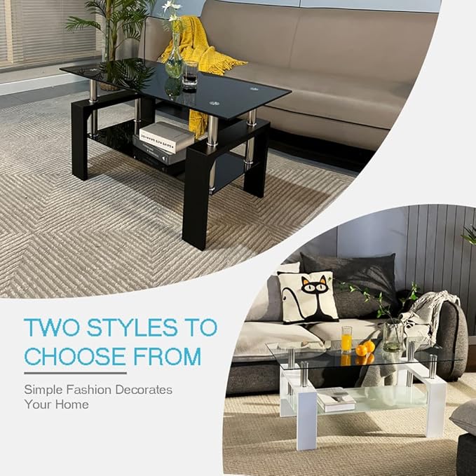 Living Room Rectangle Coffee Table, Tea Table Suitable for Waiting Room, Modern Side Coffee Table with Wooden Leg, Glass Tabletop with Lower Shelf, 39.5D x 23.5W x 17.5H in, Black