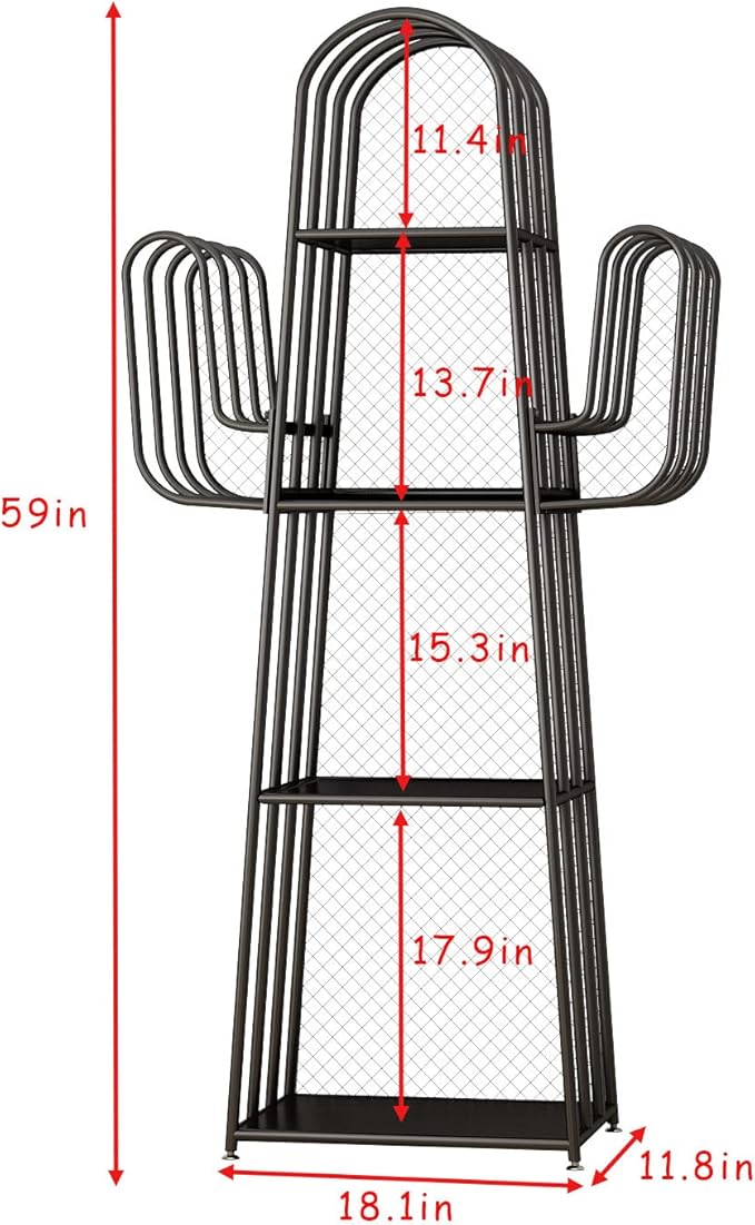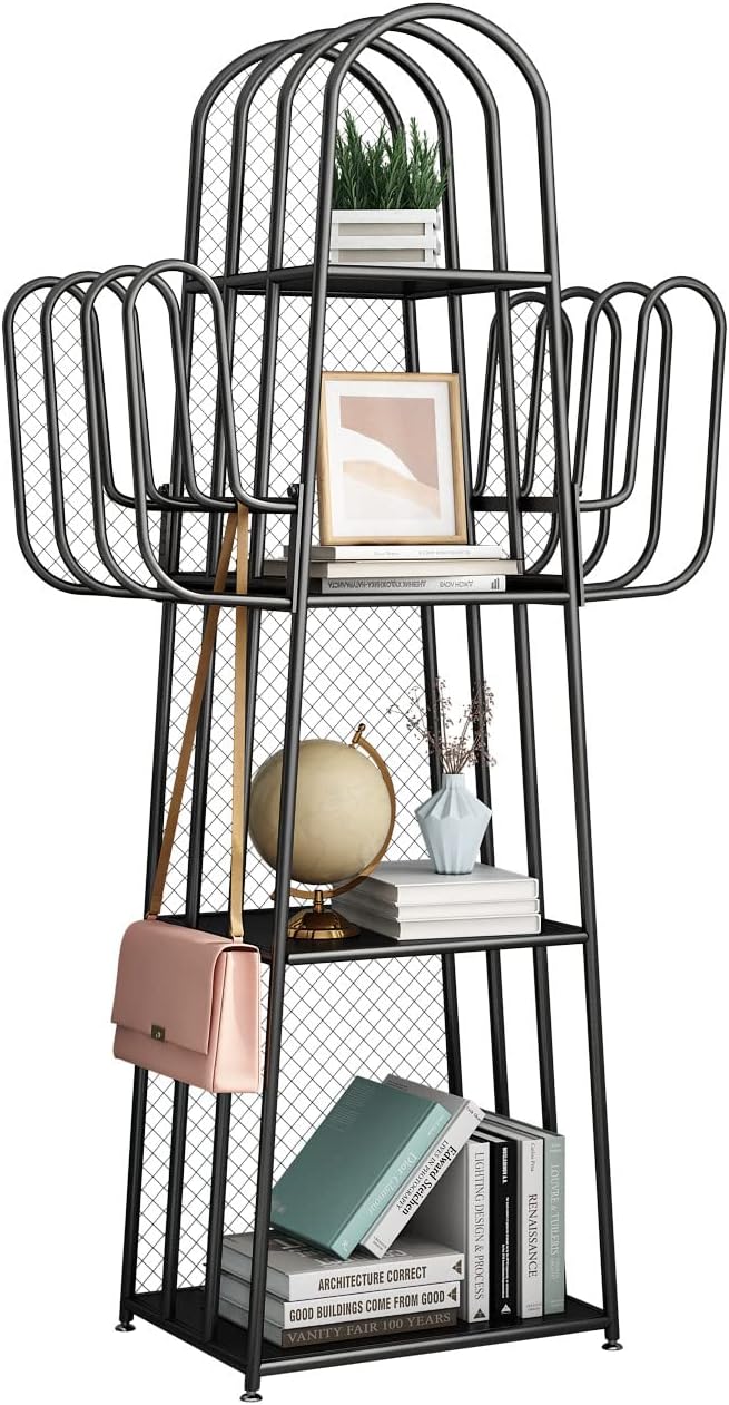 DOORXIF 4-Tier Industrial Bookshelf Freestanding, Cactus Bookcase Storage Organizer Closet Corner Metal Display Cabinet, Corner Black Bookshelf for Small Spaces, Industrial Bookcase for Bedroom Office