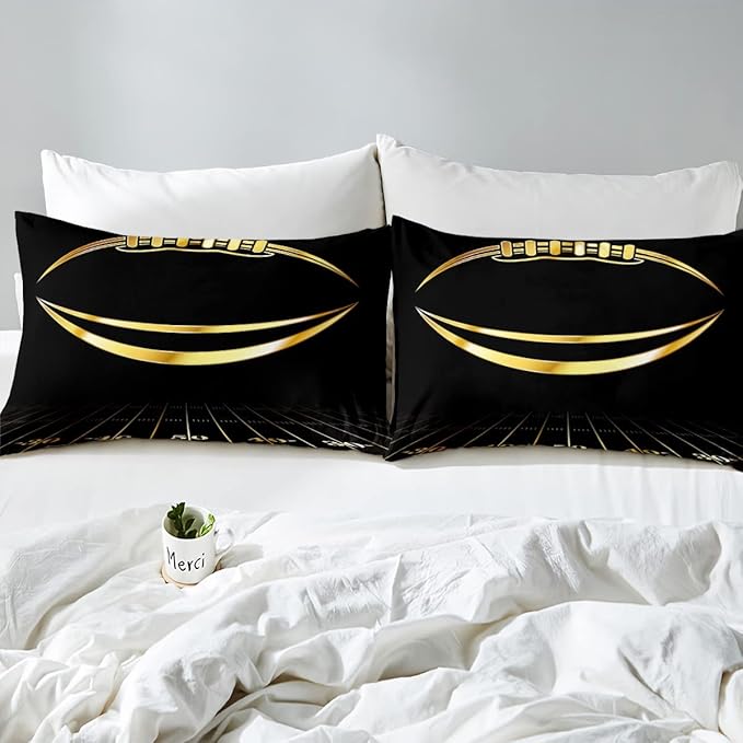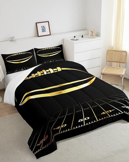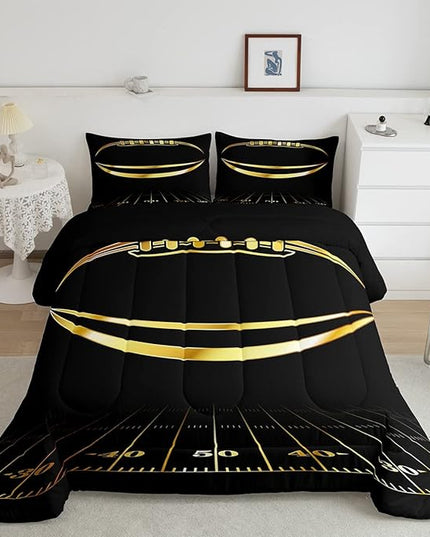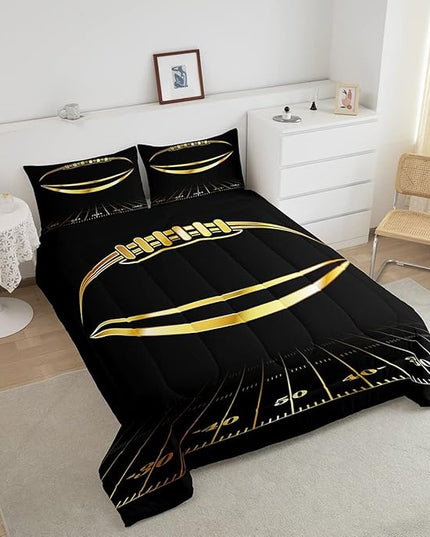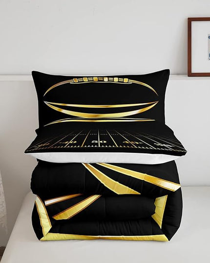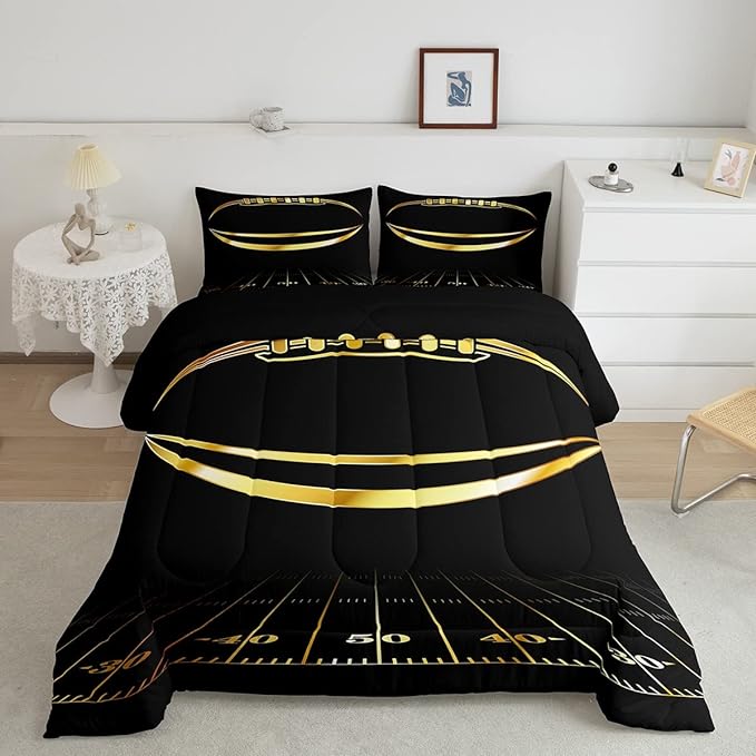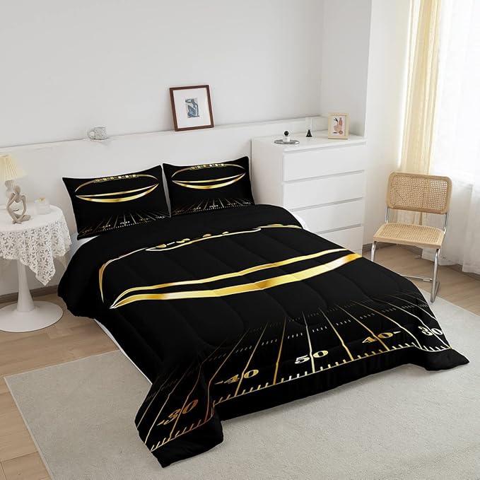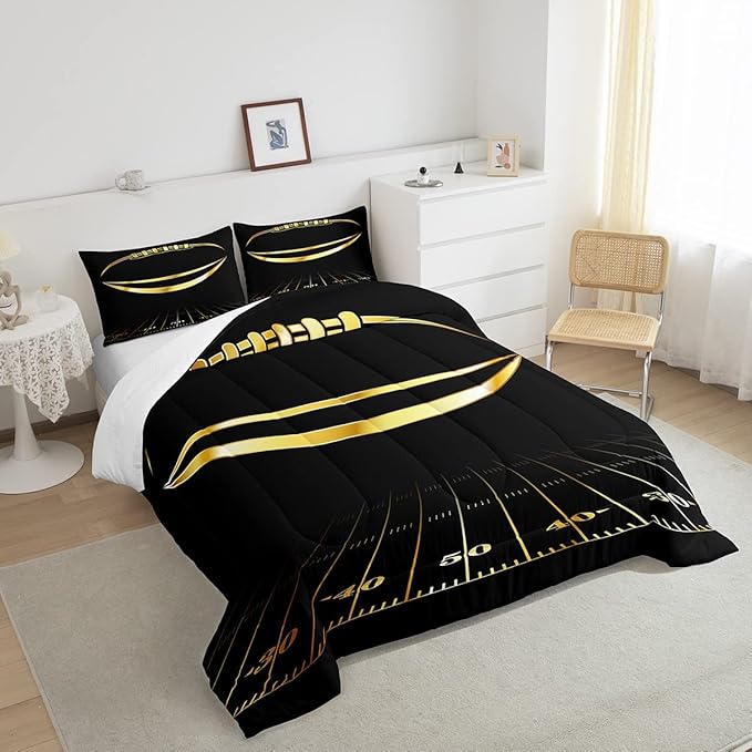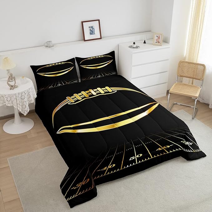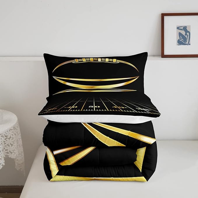 Football Bedding Set Full Kids Rugby Sports Comforter Set American Football Comforter Set for Boys Golden Black Room Decor Lightweight Quilt Set with 2 Pillow Case