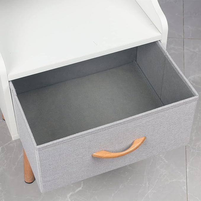 LUCKNOCK NightStand with Fabric Drawer, Bedside Table with Solid Wood Legs, Minimalist and Practical End Side Table with Open Storage Shelf for Bedroom, White.