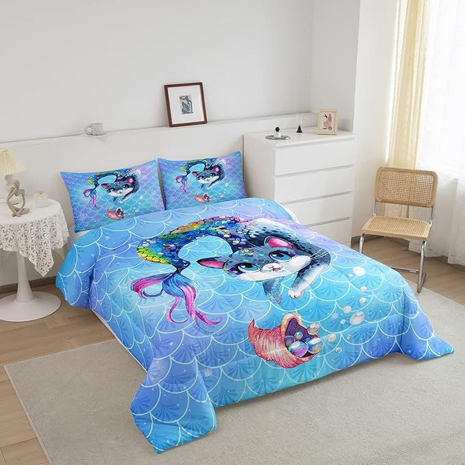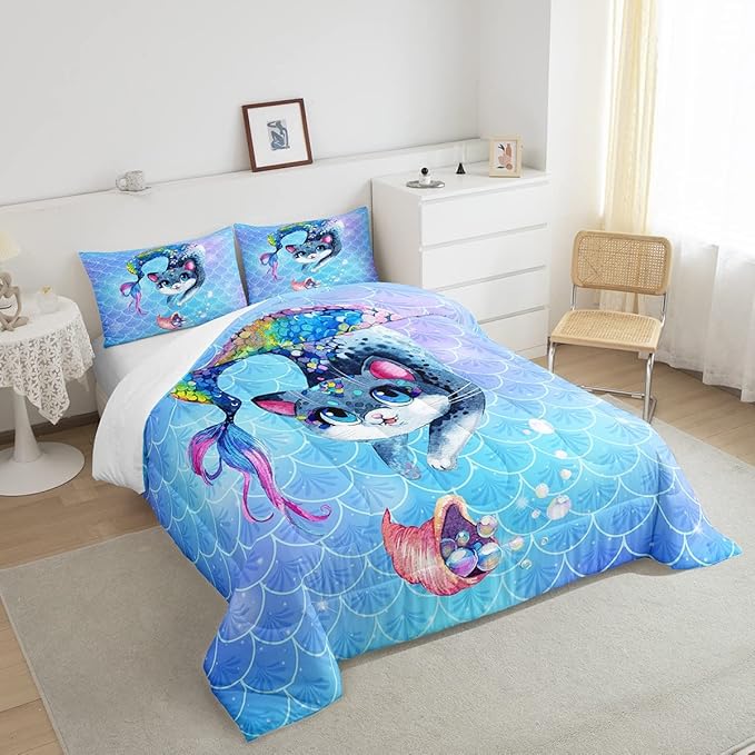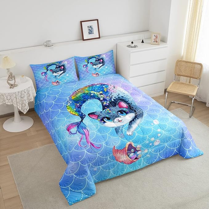 Rainbow Cartoon Cat Bed Sheet Set Colorful Mermaid Comforter Set for Kids Boys Girls Teens Room Decor Blue Mermaid Scales Bedding Set Set Ocean Gradient Style Bed Cover 2Pcs Twin Size