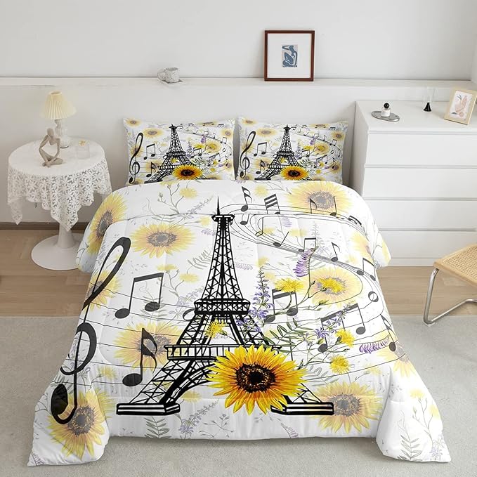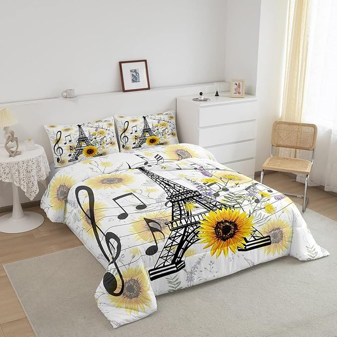 Feelyou Eiffel Tower Kids Comforter Set Cute Sunflower Bed Sheet Set for Boys Children Teens Bedroom Decor Paris Tower Bedding Set Set Floral Music Themed Bed Cover Twin Size with 1 Pillow Case