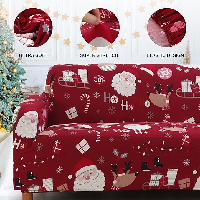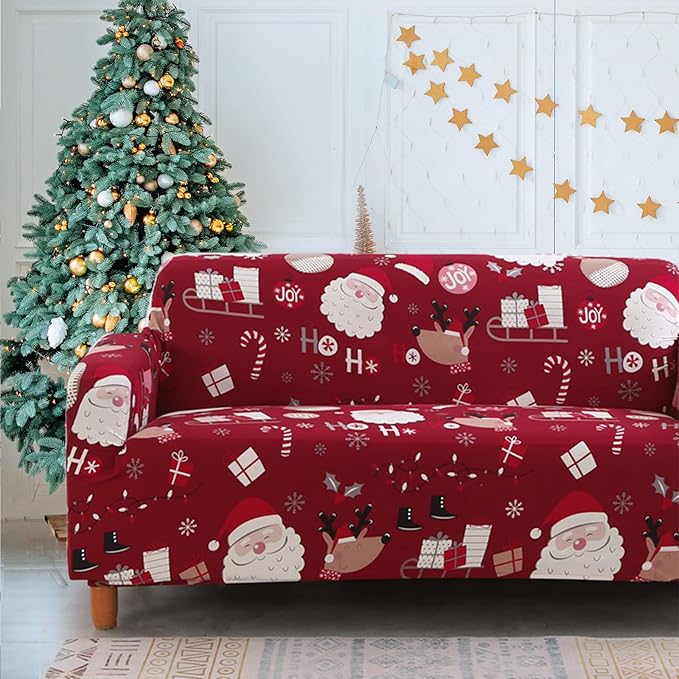 Mybedsoul Christmas Sofa Cover Santa Claus Printed Sofa Couch Cover Washable Furniture Protector with Elastic Bottom Xmas Home Room Festival Decoration(2 Seater/Loveseat)