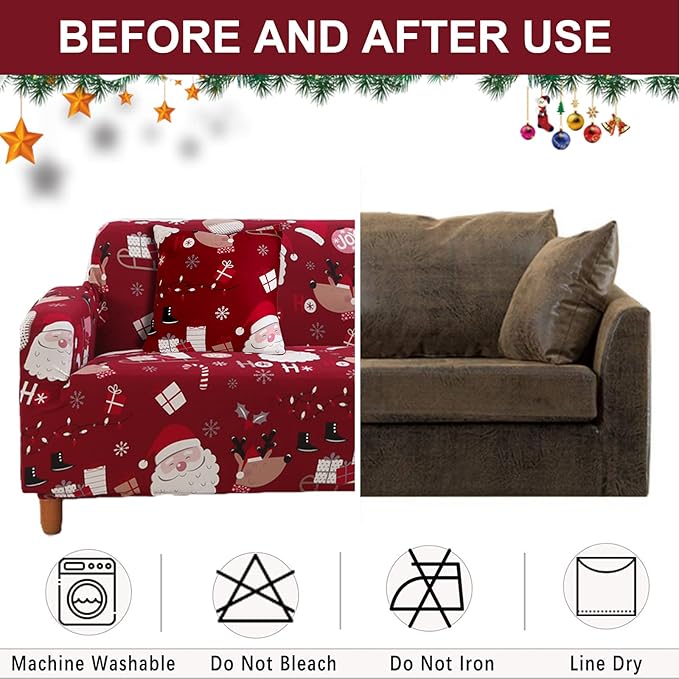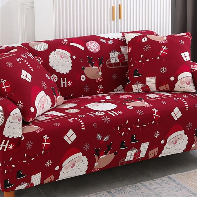 Mybedsoul Christmas Sofa Cover Santa Claus Printed Sofa Couch Cover Washable Furniture Protector with Elastic Bottom Xmas Home Room Festival Decoration(3 Seater)
