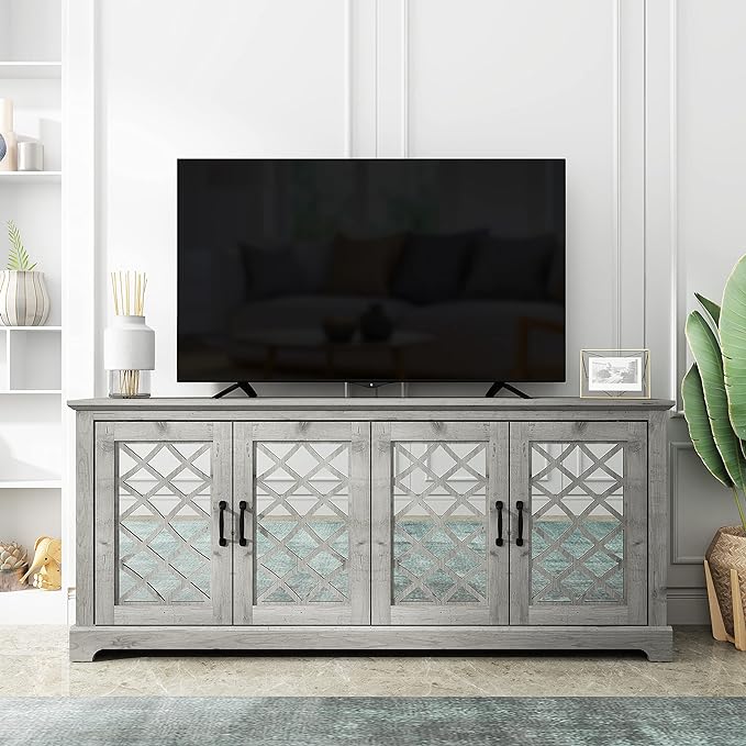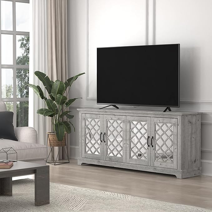 Galano Millicent TV Stand for up to 75 Inch TV, Farmhouse Entertainment Center with Mirror Doors & Storage Shelves, Rustic Media Console Cabinet for Living Room, Mexican Grey