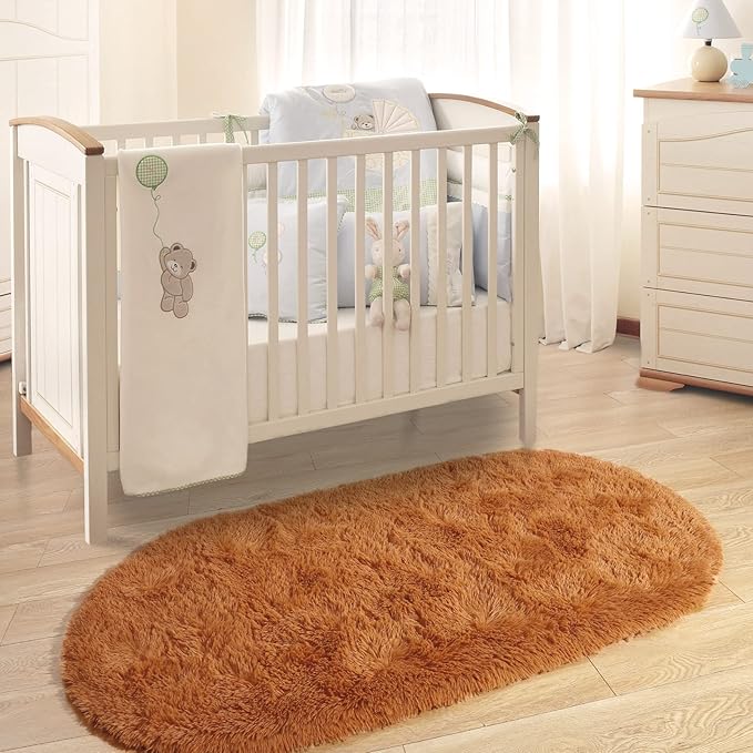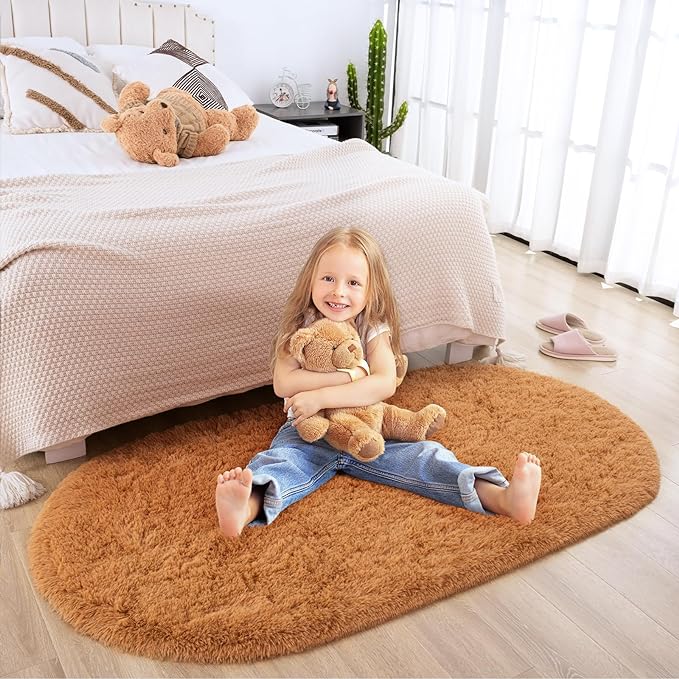 Merelax Soft Shaggy Rug for Kids Bedroom Oval 2.6'x5.3' Khaki Plush Fluffy Carpet for Living Room, Furry Carpet for Teen Girls Room, Anti-skid Fuzzy Comfy Rug for Nursery Decor Cute Baby Play Mat