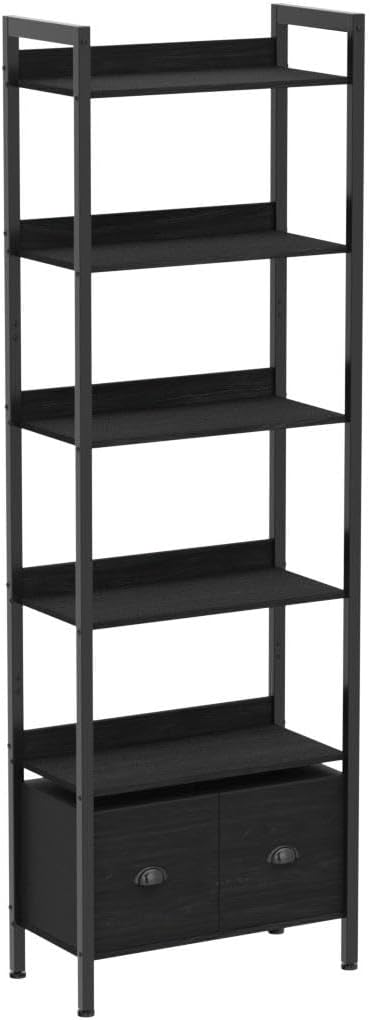 Furologee 6-Tier Bookshelf, Tall Bookcase with 2 Drawers Storage Organizer, Industrial Display Free Standing Shelf Units, Wood and Metal Storage Rack for Home Office, Bedroom, Black Oak
