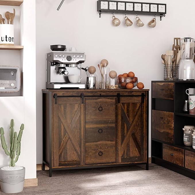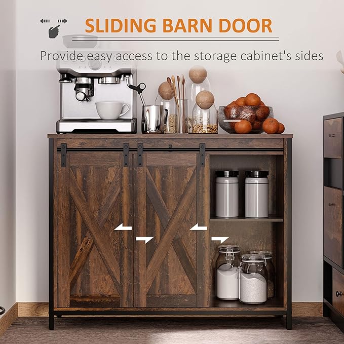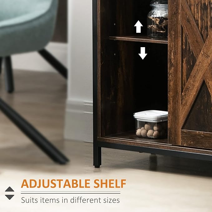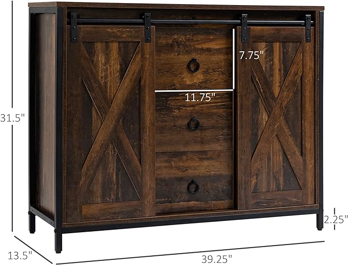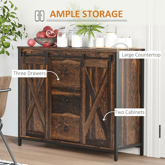 HOMCOM Industrial Farmhouse Buffet Cabinet, Kitchen Sideboard with Sliding Barn Doors, Three Drawers and Adjustable Shelves for Living Room, Rustic Brown