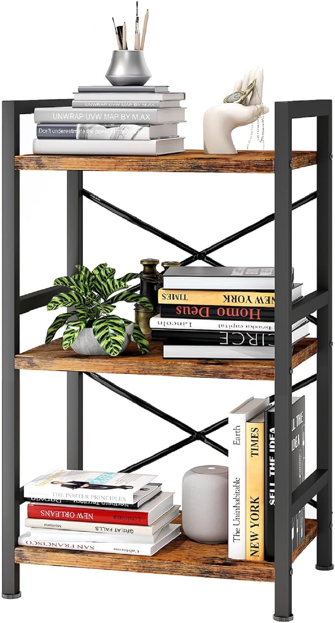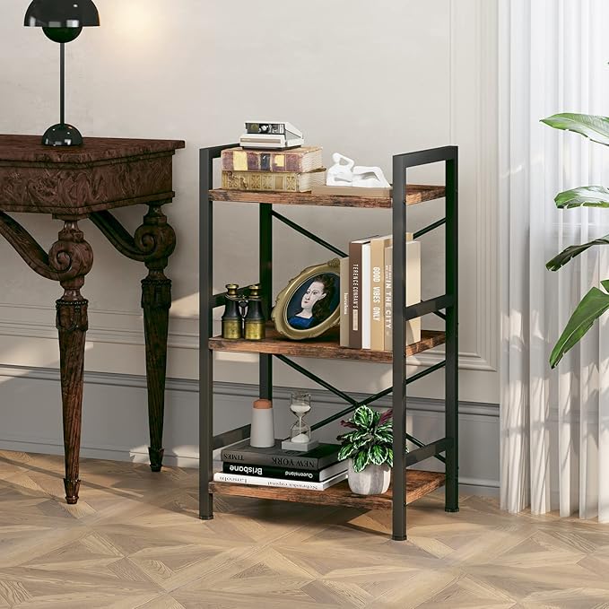 Bookshelf, 3 Tier Industrial Bookcase, Metal Small Bookcase, Rustic Etagere Book Shelf Storage Organizer for Living Room, Bedroom, and Home Office(Rustic Brown) Patent Pending D29873033