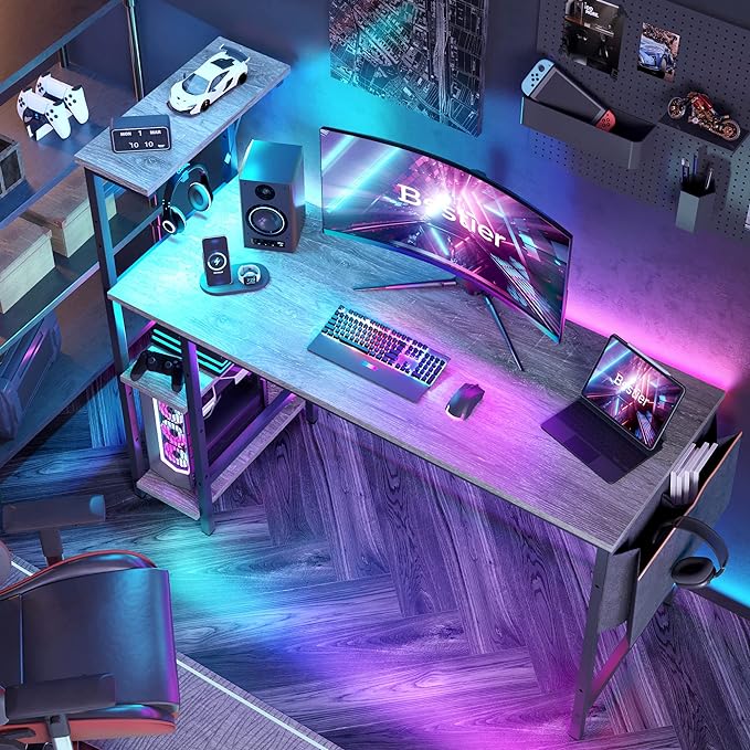Bestier Gaming Desk with LED Lights, Computer Desk with 4 Tiers Reversible Shelves, 51.3 Inch Home Office Writing Desk with Side Storage Bag, Hooks and Height Adjustable Shelf (Retro Grey Oak)