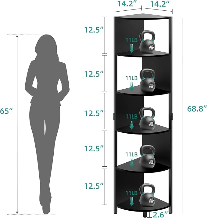 YITAHOME 6-Tier Corner Shelf, 68.8" Tall Modern Free Standing Zigzag Corner Bookshelf, 6 Shelf Display Corner Bookcase Open Small Book Shelves for Living Room, Home Office, Small Space, Black