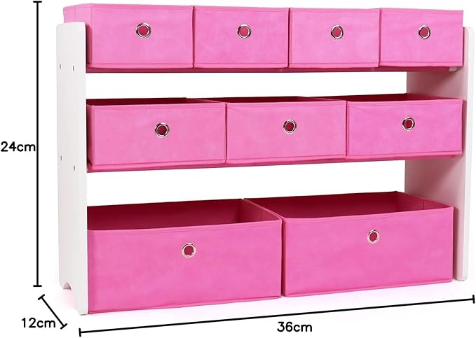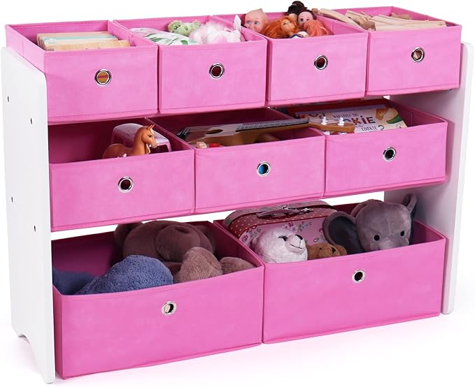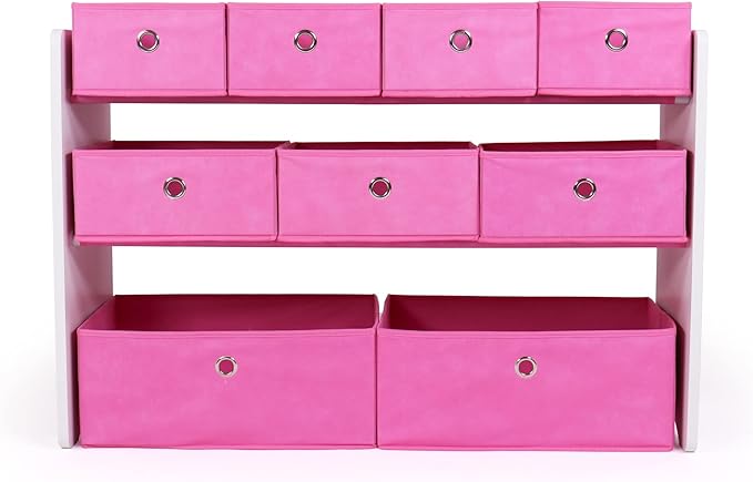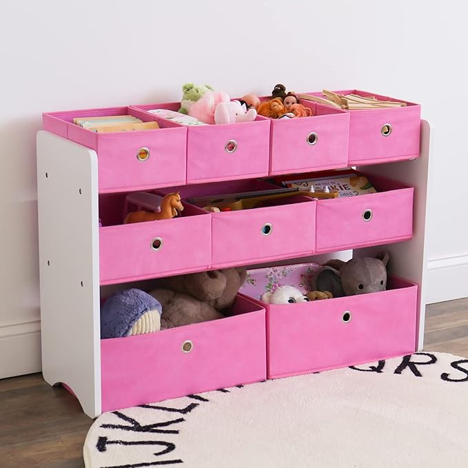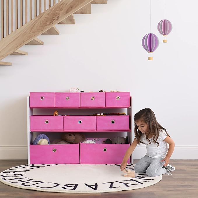 Humble Crew Kids Toy Organizer with 9 Collapsible Fabric Storage, White Wood and Pink Bins