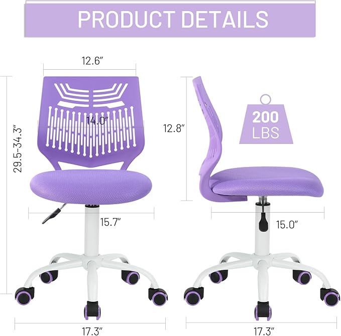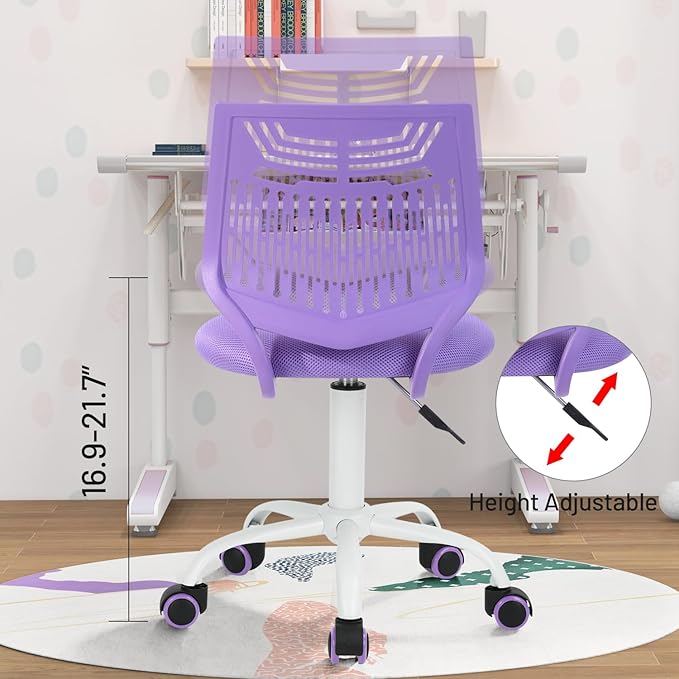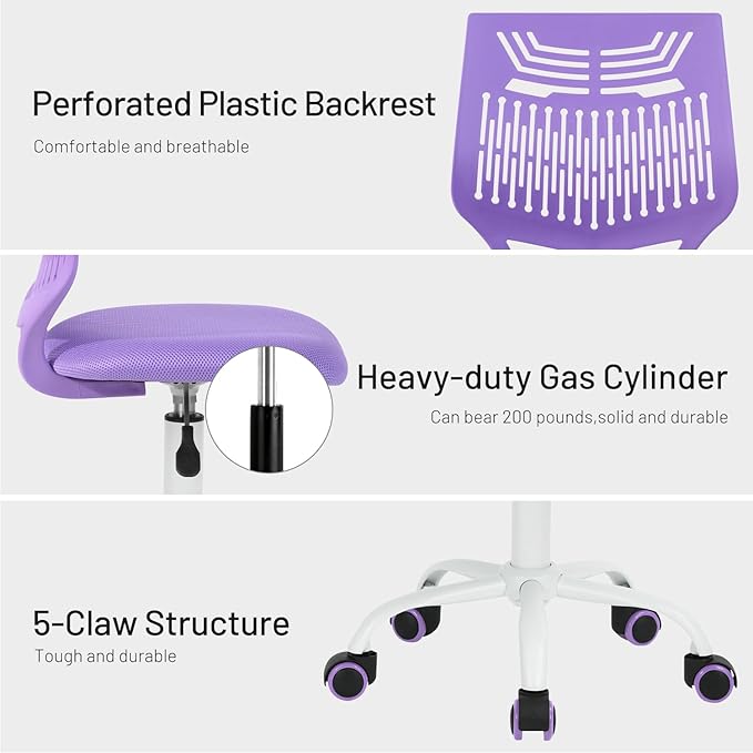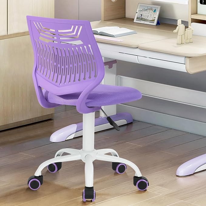 Kids Desk Chair, Armless Home Office Task Chair with Mesh Padded Cushion, Swivel Study Computer Chair with Rolling Wheels for Children Student, Purple