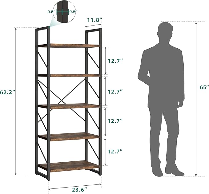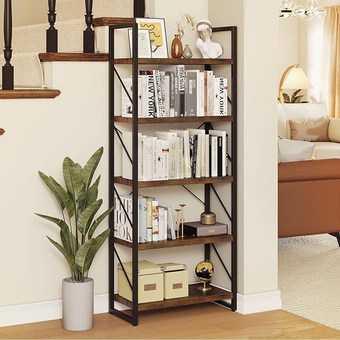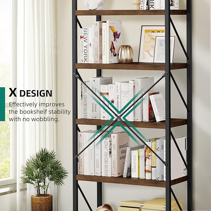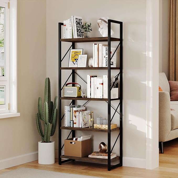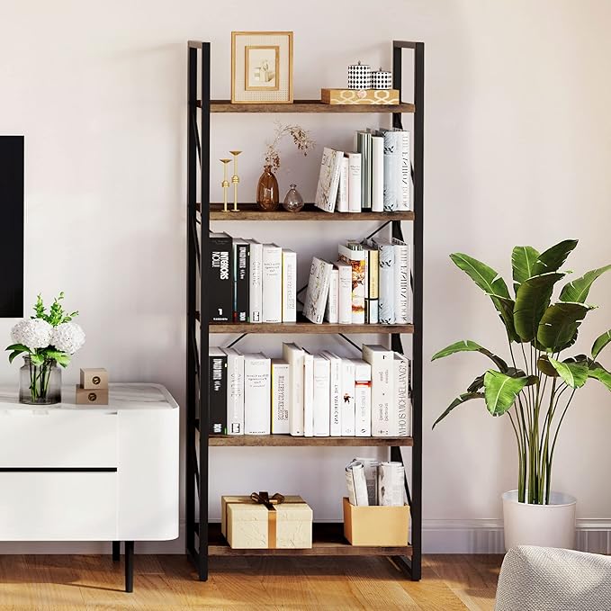 YITAHOME 5-Tier Bookshelf, Freestanding Book Shelf, Industrial Minimalist Open Display Storage Book Shelves Standing Shelving Unit for Living Room Bedroom Home Office, Rustic Brown