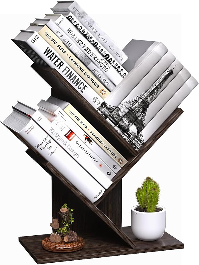 3 Tier Small Tree Bookshelf Desk Book Organizer Narrow Bookcases for Books Magazines CDs Free Standing Retro Wooden Storage Shelves for Home Office Bedroom Living Room Dark Walnut