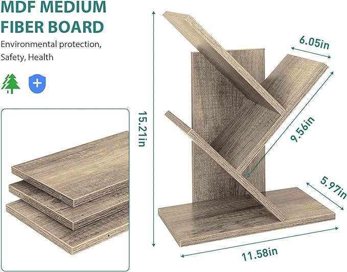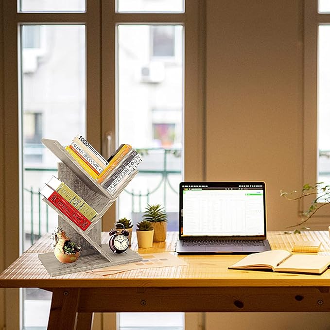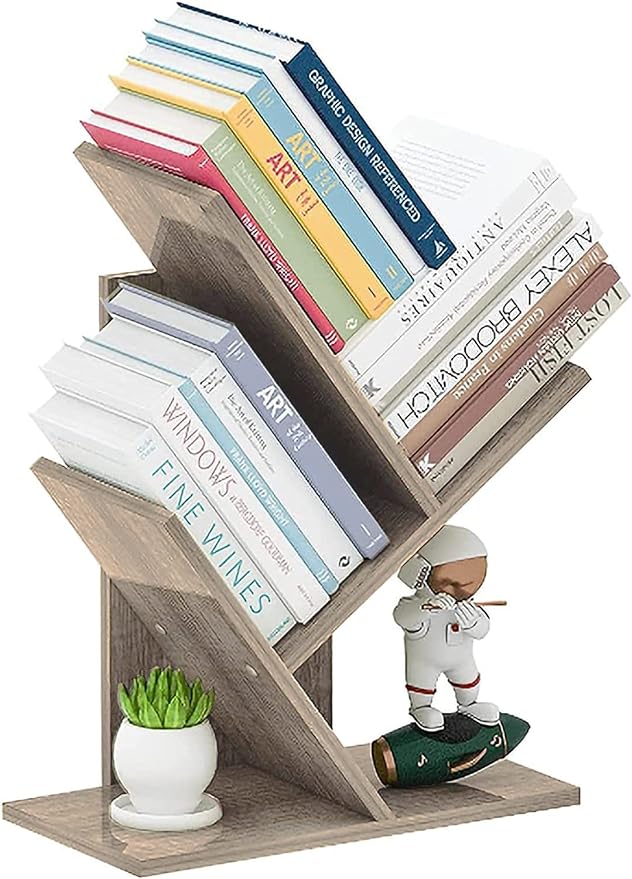 Tree Bookshelf, 3-Tier Small Book Storage Organizer Shelves Floor Standing Bookcase, Wood Storage Rack for Office Home School Shelf Display for Cd/Magazine(French Oak Grey)