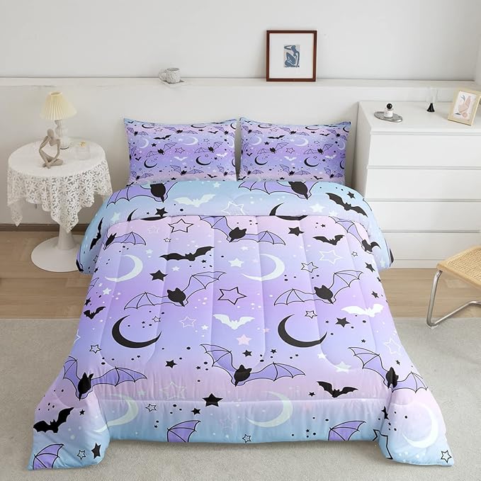 Feelyou Halloween Comforter Rainbow Comforter Set for Boys Girls Children Bat Moon Star Print Bedding Set Halloween Theme Purple Gradient Style Room Decor Queen Size Duvet Set 3Pcs