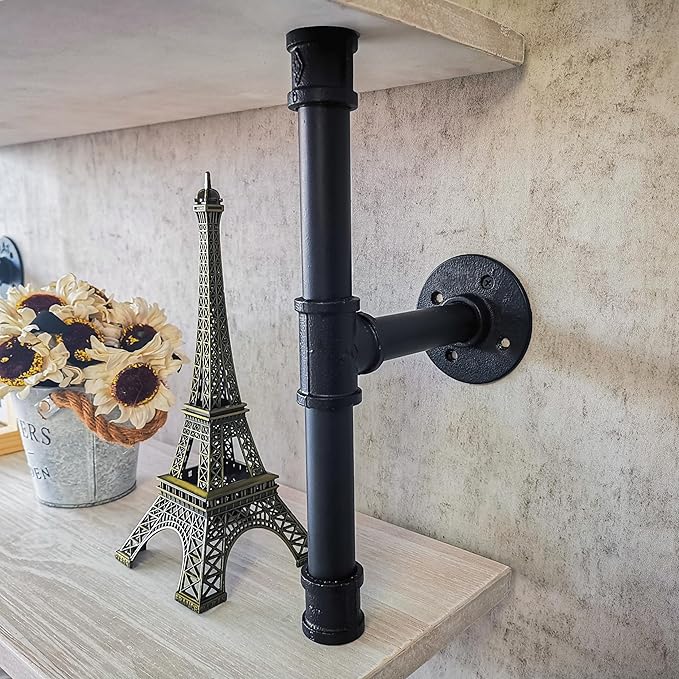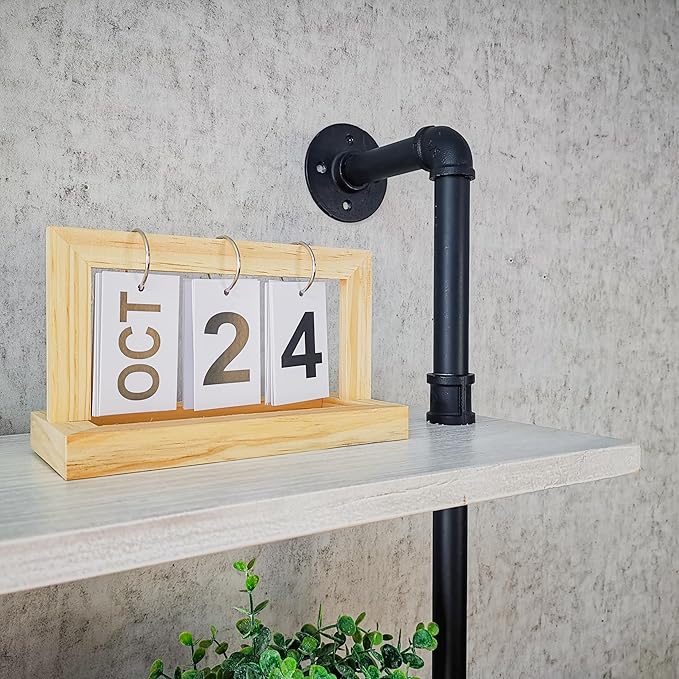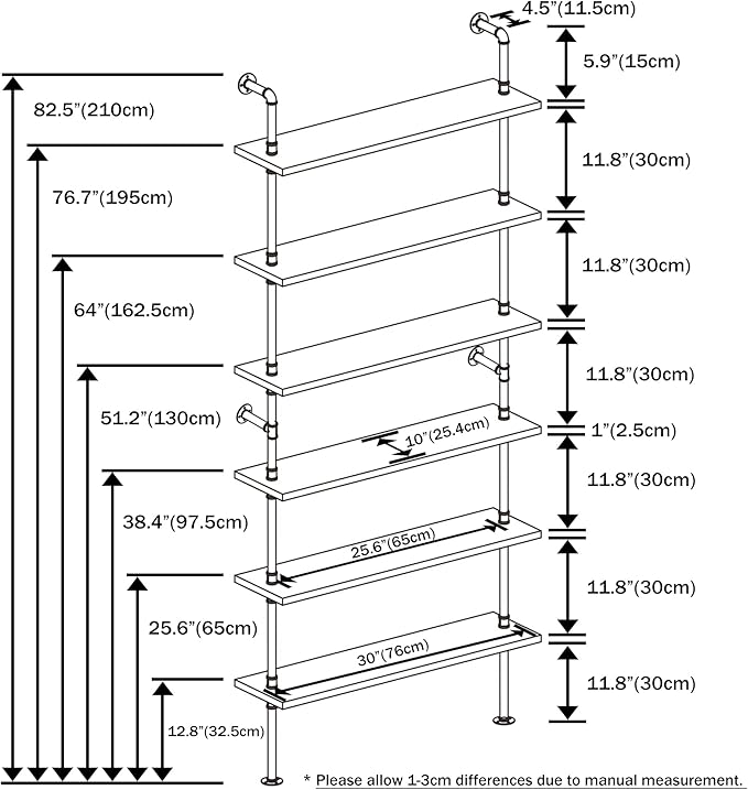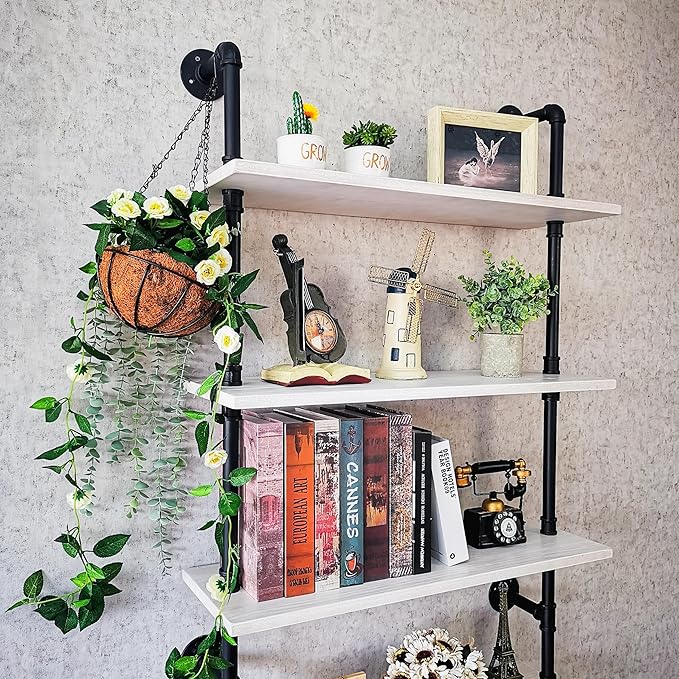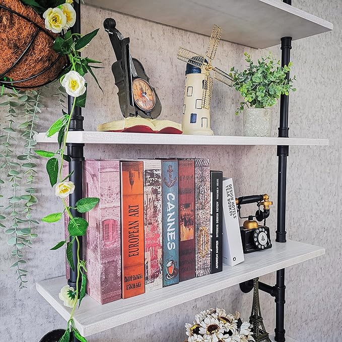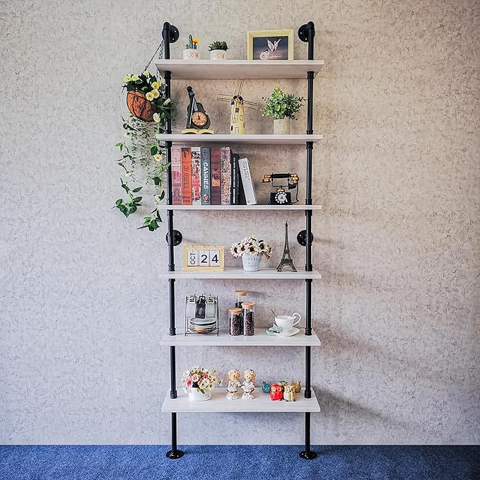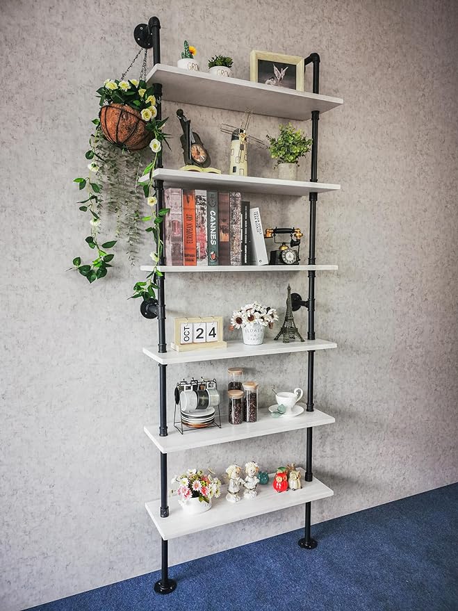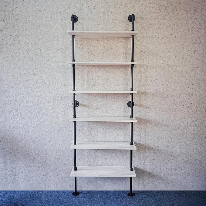 Pipe Shelves, Wall Mounted Wood Metal Industrial Shelves, Ladder Bookshelf for Living Room (White, 10" D x 30" W x 82.5" H)