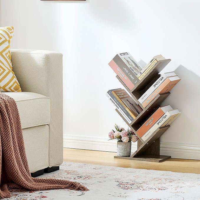 Hoctieon 4 Tier Tree Bookshelf, 4 Shelf Bookcase, Modern Book Storage, Free Standing Tree Bookcase, Utility Organizer Shelves for Home Office, Living Room, Bedroom, Greige