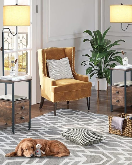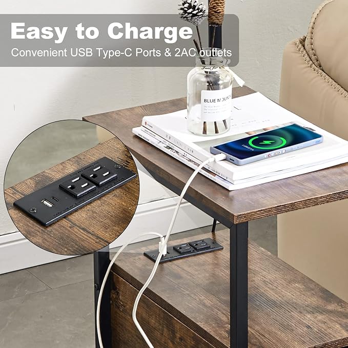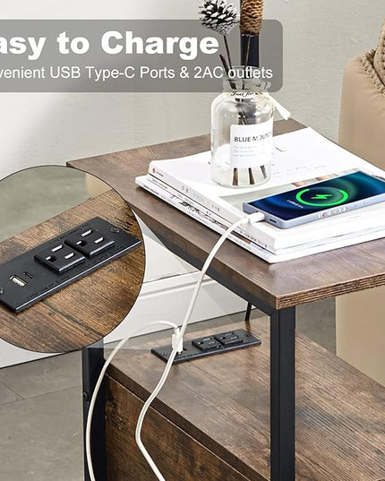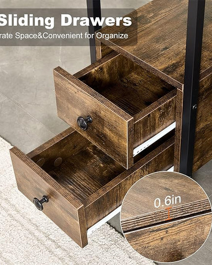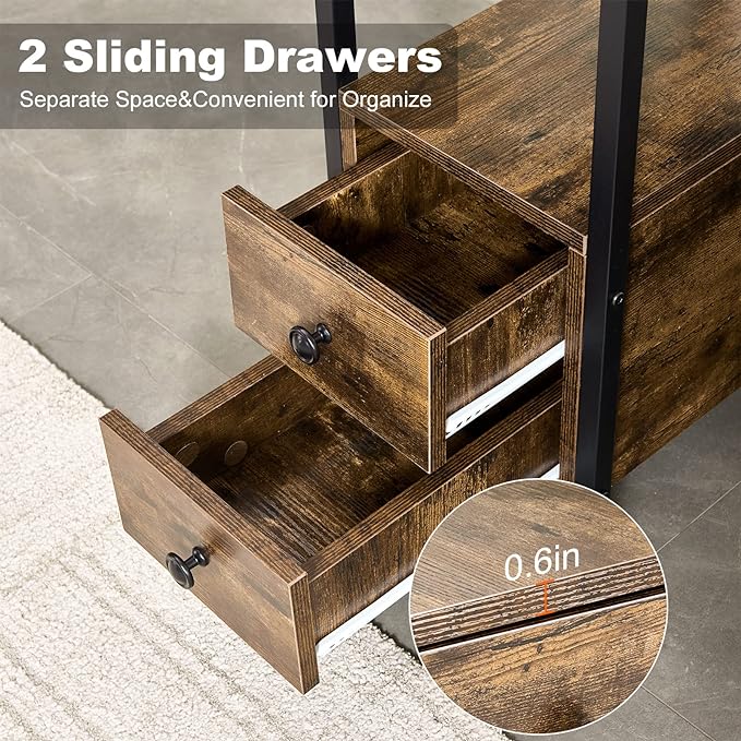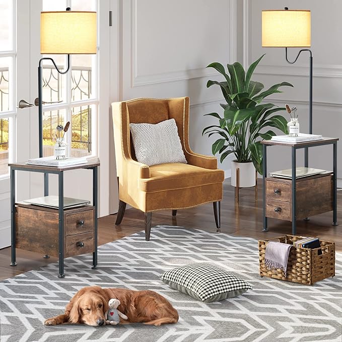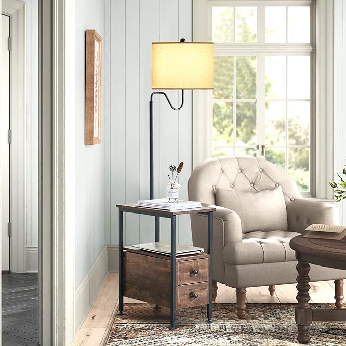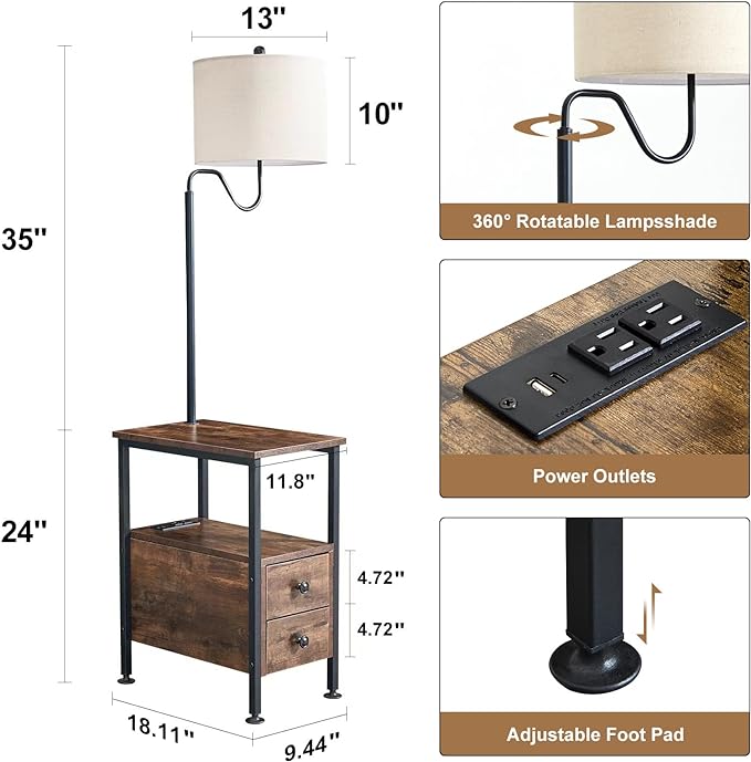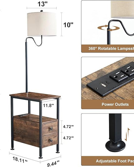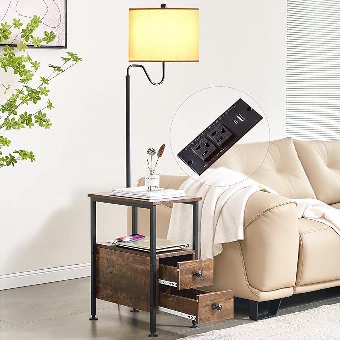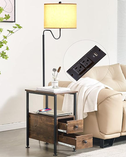 Dungoo 59" Floor Lamp with Table, Narrow End Table with Lamp Attached with USB & Type-C Ports and 2 Outlets, Rustic End Table with Storage Drawers, Bedside Nightstand for Living Room Bedroom